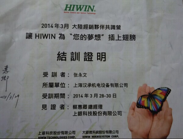 台湾HIWIN代理经销资质,代理证书,汉承公司资质